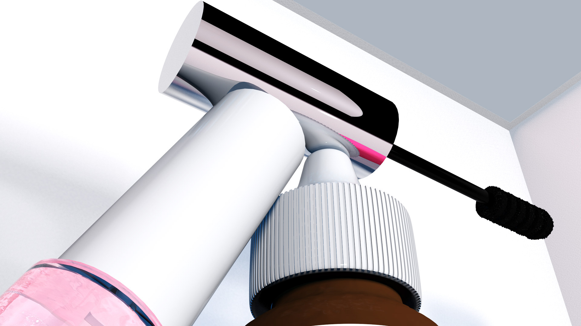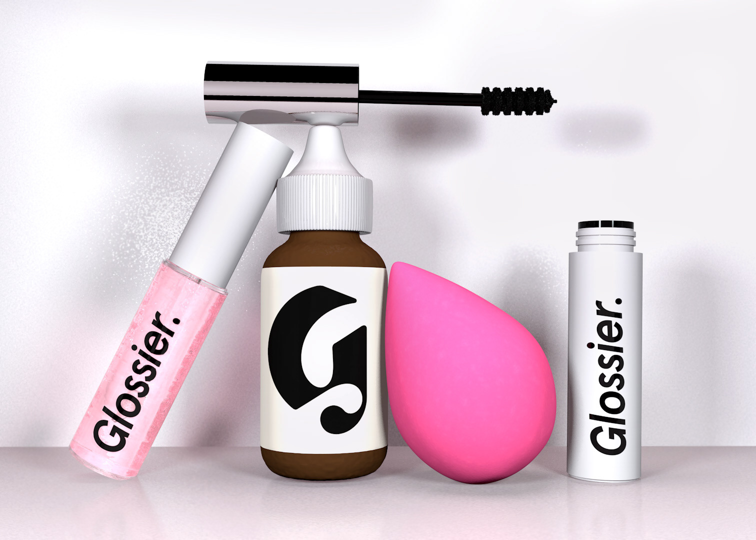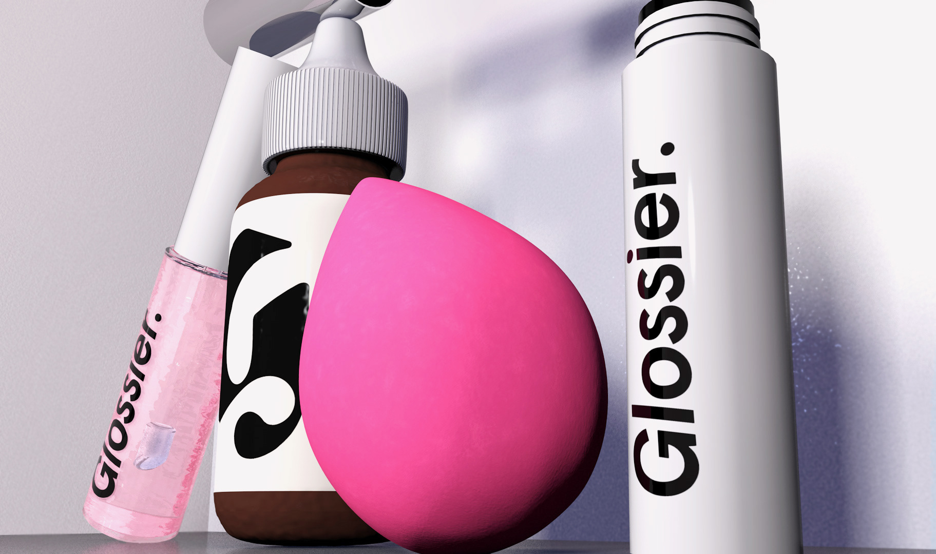 A rendered scene of Glossier products created with 3D software. All of the modeling, texturing, and lighting work was created by myself - except the Glossier logos.